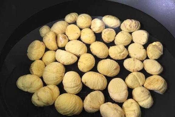 3.板栗清洗幹凈放入鍋中,加三克鹽,加沒過板栗的清水煮開後撈出板栗。