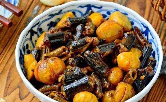 材料:黃鱔500克、板栗300克、鹽3克、生抽2湯匙、老抽1湯匙、冰糖15克、大蒜1個