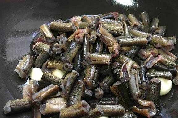 5.在油鍋中放入大蒜頭炒出香味,等明顯聞到蒜香味後再向鍋中倒入黃鱔,中火煎至表皮變色。