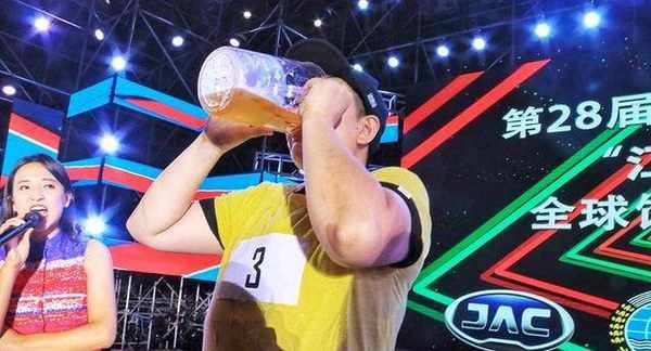 原來比賽中要求參賽選手喝完1500毫升的啤酒,用時少者為勝。