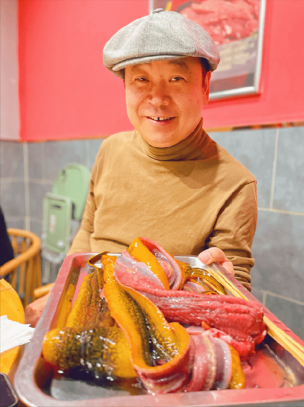 招牌菜“現劃鱔魚”用的是樂山的非遺技藝,一把牛骨刀,一張案幾,手起刀落,一條鮮活的稻田鱔就被劃得“骨肉分離”。聽龍七對漂亮的川妹子老板娘講,一斤活鱔隻能“劃拉”出半斤鱔魚肉,鮮美味正得來不易。