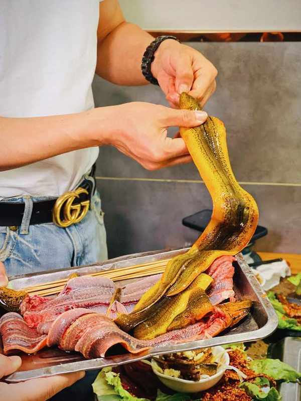 “點個自己炒料的紅油鍋底,兩份兒現劃鱔魚,油爆鱔片、爆辣鱔絲、油潑鱔魚可以三選二,泡椒鱔魚是簽簽菜,一口過癮……冒節子、大刀腰片啥的也點上,最後來兩碗蛋炒飯大傢分分,隨便來幾個朋友,怎麼點都能吃帶勁。”