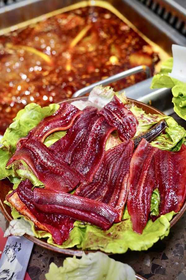 紅湯煮沸,鱔魚入鍋,鱔段在紅油中翻滾浮沉。10分鐘後吸飽湯汁撈出,口感厚實、肉質Q彈、鮮嫩入味,蘸上四川火鍋經典的蒜蓉油碟,香辣不腥,鮮香盈口,滑嫩無倫。
