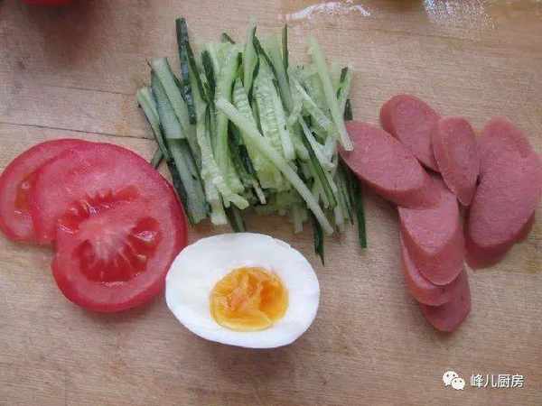 2、黃瓜切細絲,西紅柿切厚片,火腿切小片,煮雞蛋一分切兩半。
