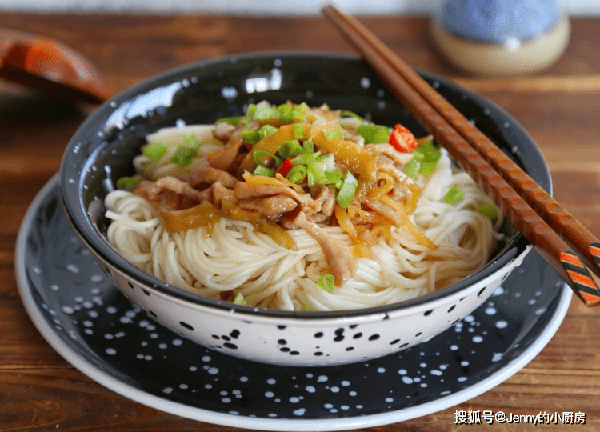 最後將面條煮熟,煮好後撈出,倒入榨菜肉絲攪拌均勻,就可以食用瞭。喜歡稀一點的話,少煮些面條,多盛些湯就可以瞭。
