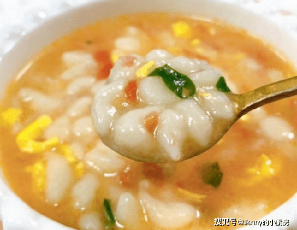 最後倒入小疙瘩,一邊倒一邊攪拌,煮到疙瘩和蔬菜熟,再淋入蛋液,或者倒入肉末攪拌均勻,調味後就可以關火瞭。