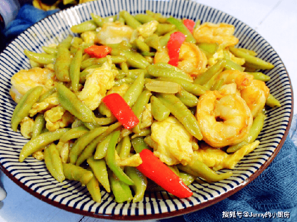另起鍋加油,燒熱後倒入蛋液,炒成小塊盛出。再放入蝦仁,炒到變色。