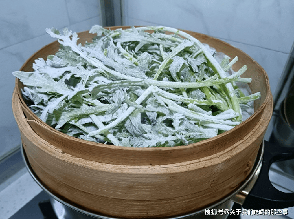 2、蒸籠裡鋪上打濕的籠佈,放上裹瞭面粉的茼蒿,蒸鍋加水燒開,放上茼蒿蒸5分鐘,取出後趁熱抖散,放入盤中。