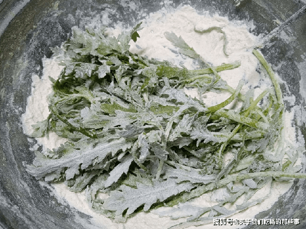 1、茼蒿洗幹凈,稍微瀝一下水,表面沒有明顯的水珠即可。把茼蒿放入盆中,加一勺面粉,用手不停地翻拌,讓每片茼蒿葉都裹上一層薄薄的面粉。
