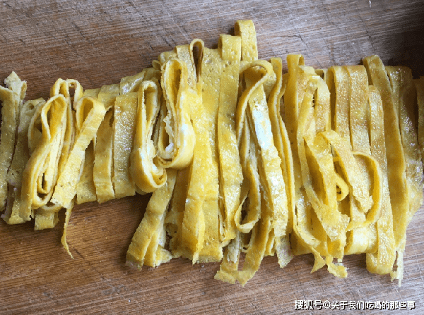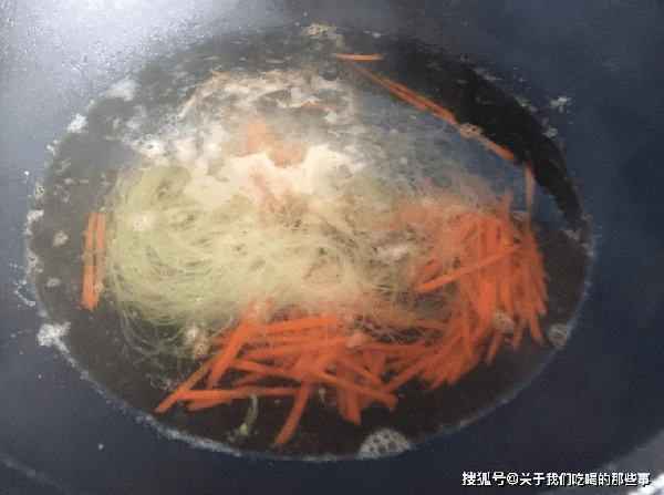 2、平底鍋倒入適量油,倒入雞蛋液,攤成雞蛋皮,小火煎至定型後盛出,切成細絲備用。另起鍋,倒入適量清水燒開,放入粉絲煮1分鐘,撈出過涼水,瀝幹水分。