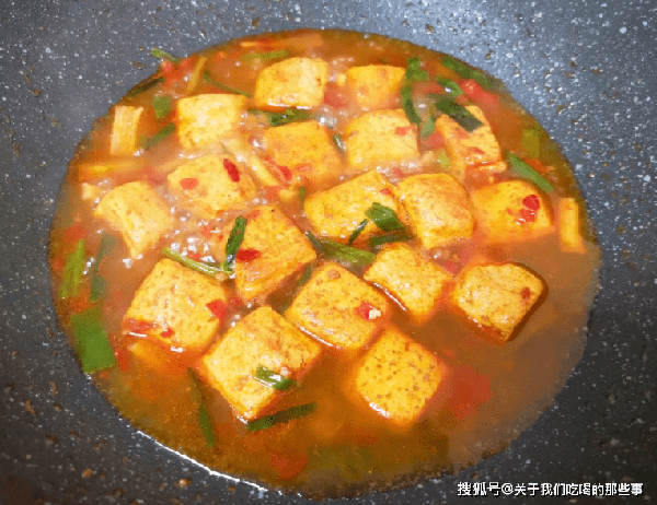 2、鍋裡留底油,燒熱後放入蔥段、薑絲爆香,加入一勺豆瓣醬炒出紅油,倒入煎好的豆腐塊翻炒均勻,加入半碗開水煮開,小火燉3分鐘,讓豆腐充分吸收醬汁。