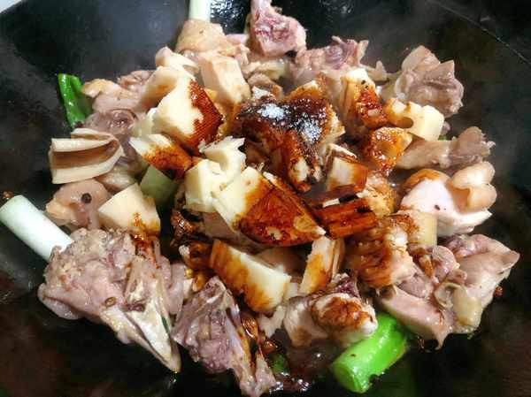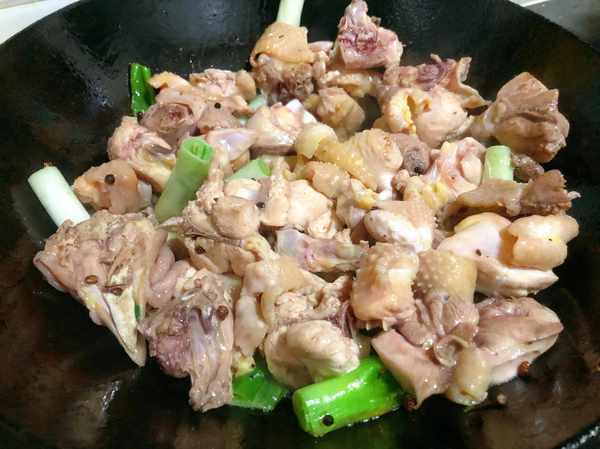 (2)熱鍋涼油放入大蒜,大蔥,花椒,八角炒出香味,然後放入雞肉煎至變色