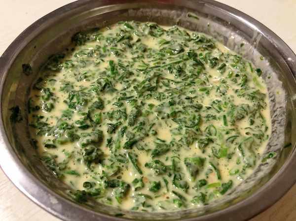 (2)然後攥幹菠菜的水分,切成碎丁裝盤備用