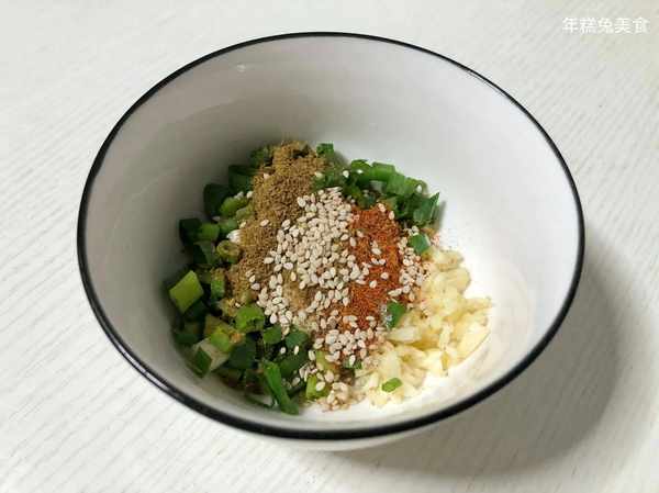 (2)準備小料:3個大蒜拍扁剁碎,切2根小蔥,然後放1勺辣椒面,1勺白糖,1勺五香粉,2勺孜然粉,適量鹽雞精,少許熟芝麻 白胡椒粉
