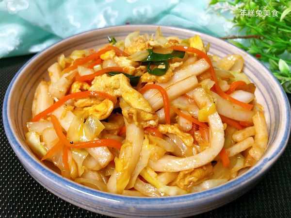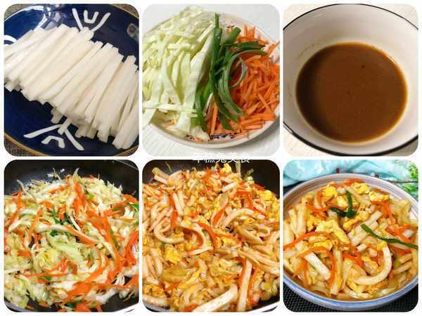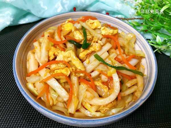 (6)接著倒入年糕條炒軟,最後倒入料汁不停地翻炒將湯汁收幹就可以出鍋瞭