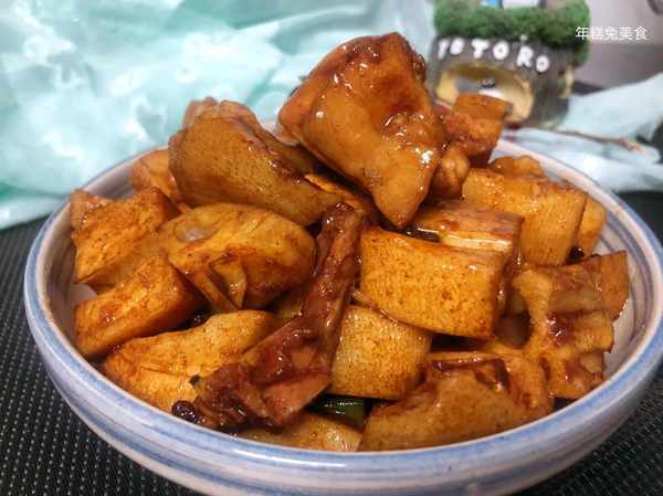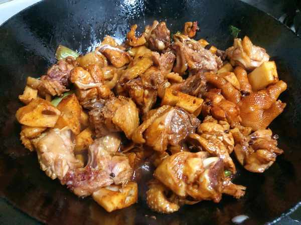 (3)接著放入蓮藕,加2勺老抽,1勺白糖,1勺料酒煸炒均勻,加入半碗開水燜15分鐘
