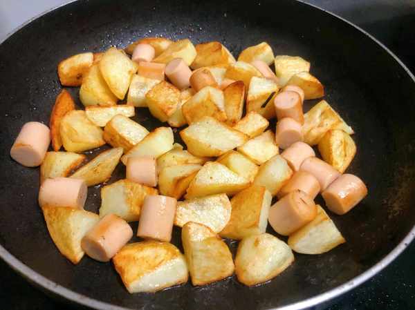 (3)鍋中倒油放入蒸好的土豆塊,火腿腸,不斷地翻面煎至外皮金黃色,土豆用筷子穿一下可以輕松穿透就代表熟瞭