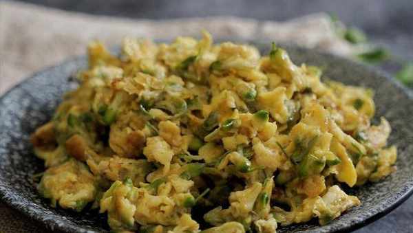 香椿洗凈,開水下鍋焯燙2分鐘,待其徹底變綠後,盛出來瀝幹水分,切碎備用。雞蛋打在碗裡,往裡面加上香椿,然後用一勺鹽調味,攪拌均勻。起鍋燒油,倒上香椿蛋液,開始翻炒,炒熟後盛出來,開吃。
