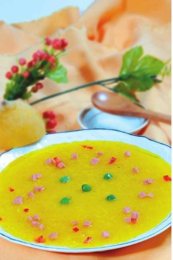 2 鍋置中火上,加入蔥油,燒熱後放入土豆泥、火腿丁,再加入精鹽、味精、白糖、檸檬黃炒勻,倒入鮮湯略燒入味,勾芡,淋入香油、撒上青豆,出鍋裝盤即成。