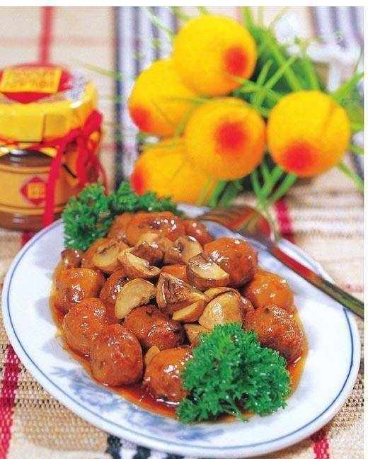 4 鍋內留底油,下入薑末、蘑菇翻炒,然後下入鮮湯,調整鹽味,放蠔油,下入炸好的芋丸,用小火將芋丸燒入味,待燒到湯汁較濃時,稍勾濃芡,淋尾油,出鍋裝盤,撒紅椒末、蔥花即成。