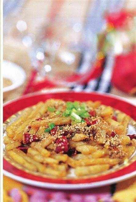 2 鍋內留少許底油,下入幹椒段、薑米、蒜蓉,炒香後下入炸好的土豆條,烹麻辣鮮,撒上熟芝麻、蔥花一起拌勻,淋香油、紅油,出鍋裝盤,拼上香菜。