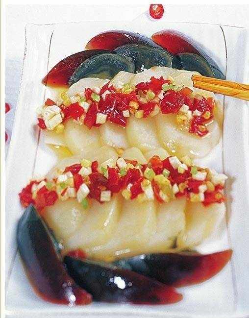2 將剁辣椒、蒜末、精鹽、味精、植物油拌勻,蓋在土豆和皮蛋上,上籠用旺火蒸 10 分鐘左右取出,淋上燒熱的香油、撒上蔥花即可。