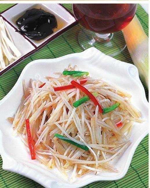 3 凈鍋置旺火上,放植物油,燒熱後下入薑絲、土豆絲拌炒,放鹽、味精,烹入白醋,放入紅椒絲、蔥段,翻炒均勻後出鍋裝盤。