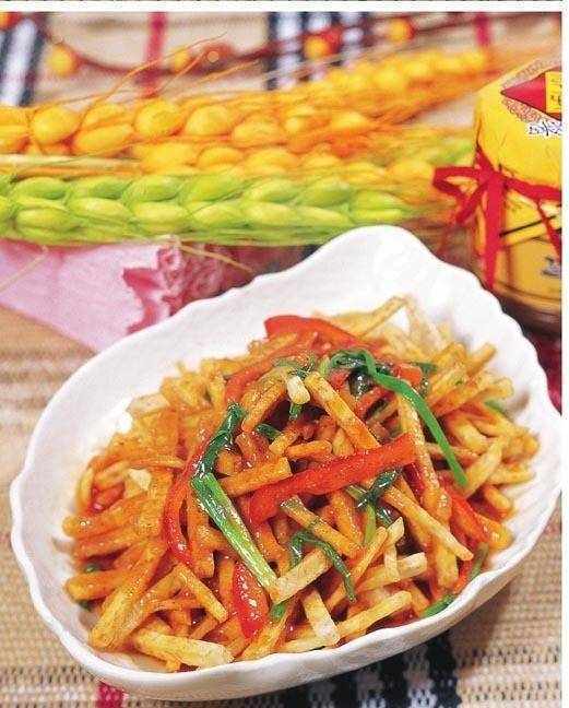 1 將鮮紅椒去蒂、去籽後洗凈,切成絲;將去皮的凈土豆切成絲。