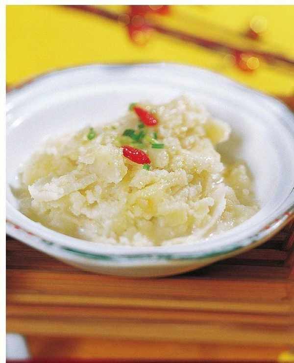 1 將土豆去皮、洗凈,切成 0.3 厘米厚的片,入沸水鍋中焯水燙熟,撈出瀝幹水,壓制成土豆泥。