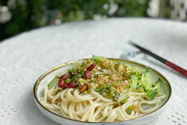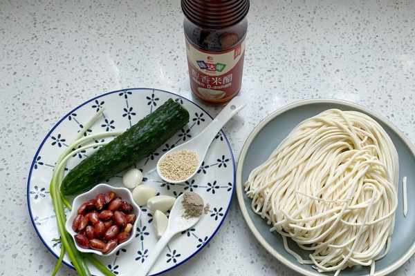 所用食材:鮮面條250克,黃瓜半根,花生米少許,小蔥2根,大蒜4粒,白芝麻1勺,黑胡椒粉1勺,香醋2勺,生抽2勺,蠔油1勺,鹽半勺,糖1小勺,植物油適量
