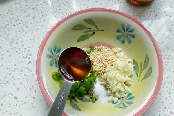5、把蔥花、蒜末、白芝麻、生抽、蠔油、香醋、糖、鹽,全部放在一起,喜歡吃辣的還可以把小米辣切碎,放裡面。