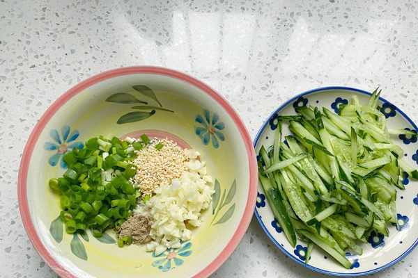 2、把小蔥切成蔥花,大蒜切蒜末,黃瓜切成黃瓜絲,裝盤備用。