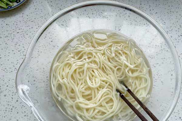 4、煮熟的面條瀝幹水撈出,放入冰水或者冷水中,浸泡片刻。