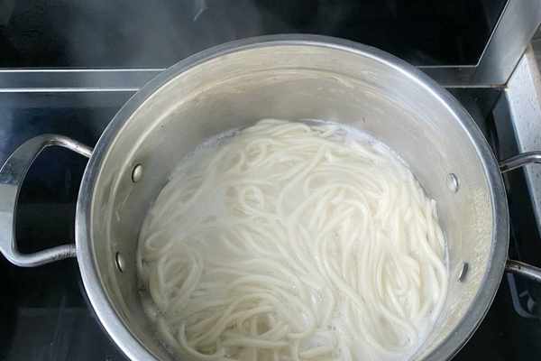 3、湯鍋裡加入清水煮沸後,下入面條,中火煮四五分鐘,把面條煮熟。