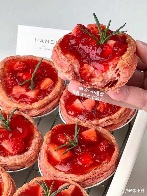 草莓蛋撻:草莓蛋撻皮,雞蛋4個,蛋黃4個,細砂糖60g,牛奶240g,淡奶油400g,草莓粉20g,草莓丁適量,草莓脆啵啵適量。