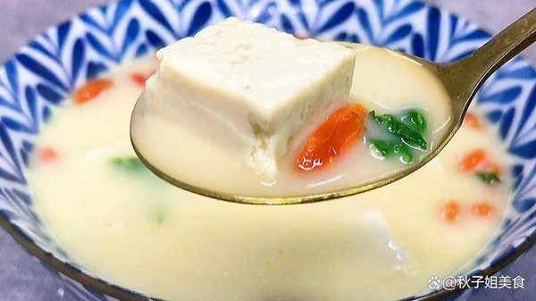 2、過濾掉殘渣,再將濃白的湯汁倒入煲湯的鍋中,之後倒入豆腐,加鹽,胡椒粉提味增香,中火慢煮十分鐘,加枸杞、香菜、香油提味,鯽魚豆腐湯就做好瞭。