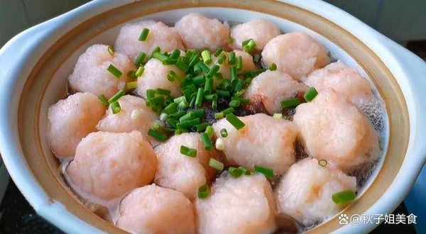 2、起鍋燒油,放入蔥白炒香,然後倒入一大碗開水,水開放入薑絲,然後用虎口擠入丸子,先開最小火煮,翻拌使它受熱均勻,再放入一小把紫菜,大火煮開。水開調入鹽和雞精,水開中小火煮二分鐘,就熟瞭,最後撒入蔥花即可出鍋。