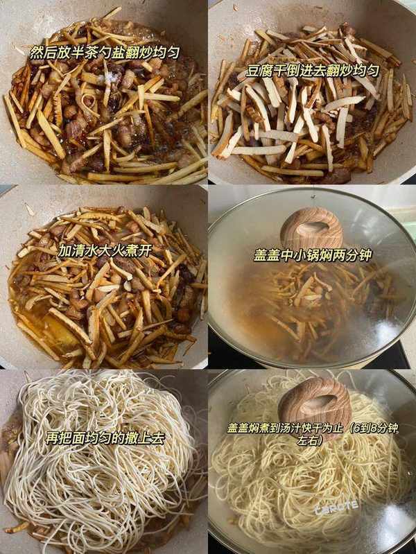 3、然後放半茶勺鹽翻炒均勻,再把豆腐幹倒進去翻炒均勻,加適量清水大火煮開蓋蓋中小火燜兩分鐘