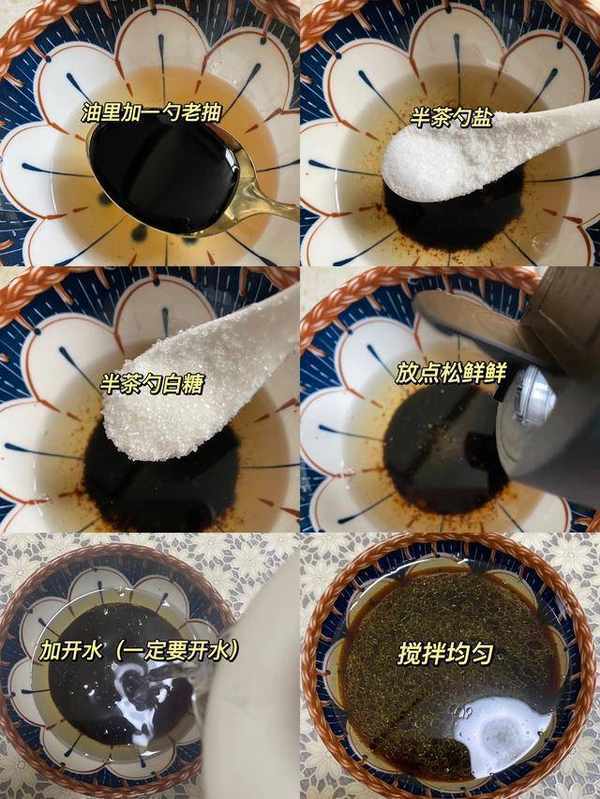 5、剛剛盛出的油、一勺老抽、半茶勺鹽、半茶勺白糖、少許松鮮鮮、開水攪拌均勻備用(媽媽說一定要用開水沖才可以)
