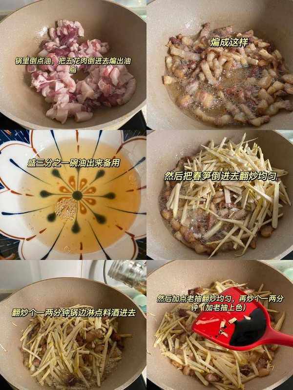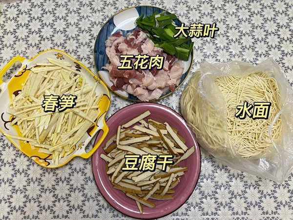 準備食材:春筍,五花肉,豆腐幹,大蒜葉,水面(所有食材都改刀備用)