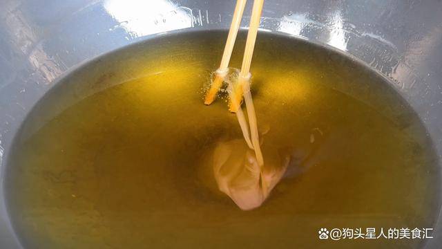 7.起鍋倒油,開大火把油溫升高。用筷子紮進油鍋裡面,看到筷子四周冒密集的泡泡說明溫度夠瞭。