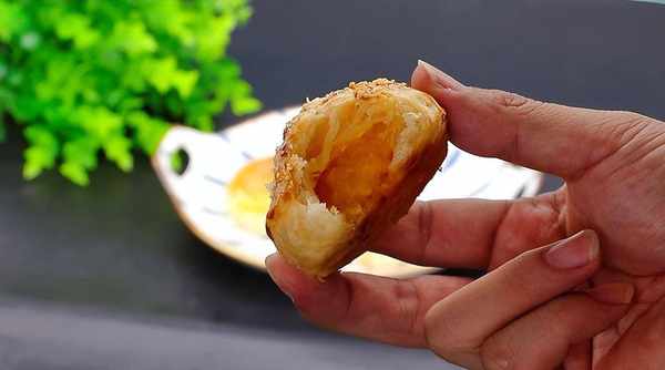 3、 準備3張手抓餅,把它們疊放在一起,待餅變軟後從一邊卷起,卷成一個卷。