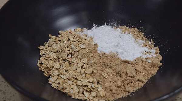 3、 把炒熟的薏米倒進料理機中攪打成粉末,將粉末倒入碗中,往裡面加入20g木糖醇和適量燕麥,攪拌均勻。