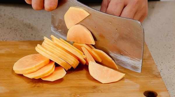 1、 把紅薯的表面用清水沖洗幹凈,削去表皮切成片狀,再放入蒸鍋內蒸熟。