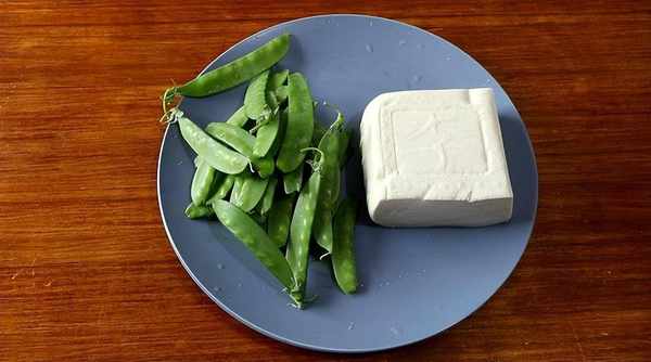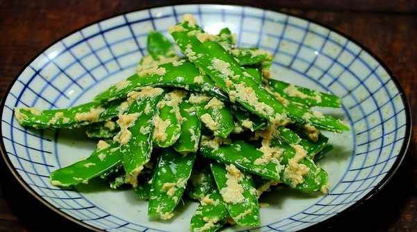 4、 等到把豆腐裡面的水分擠掉以後,倒出豆腐碎,跟荷蘭豆放在一起,往裡面加入少許鹽、芥末、耗油和花生醬,帶上手套抓拌均勻即可。