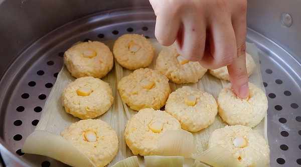 3、 接著用手將面糊搓成圓餅的形狀,放入蒸鍋內蒸上10分鐘左右。