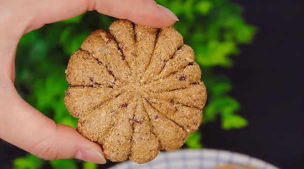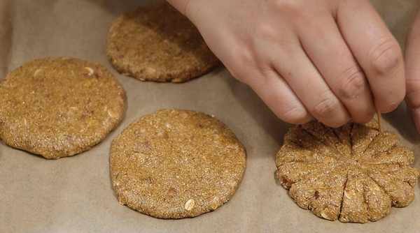 6、 把面團按壓成自己喜歡的餅狀,在烤盤上鋪上一層烘焙紙,把捏好的雜糧餅整齊的擺放在烤盤上面,再放到烤箱裡160度烘烤20分鐘即可。