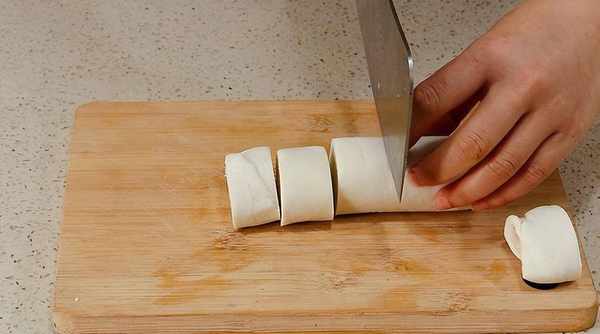 4、 卷好之後切成大小一樣的小段,再用手把每一個小段按壓成窩狀。