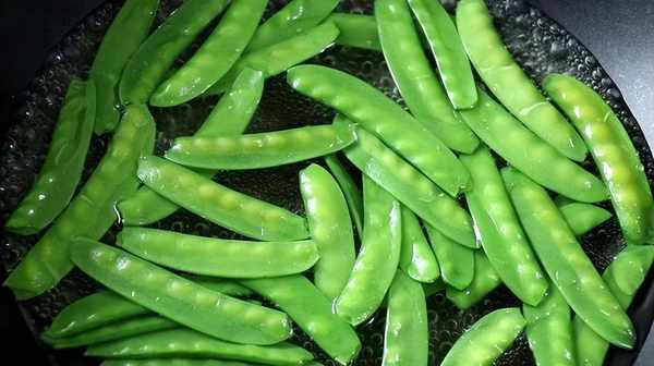 2、 鍋中加水燒開,把荷蘭豆放進去,燙軟後撈出放入大碗中。