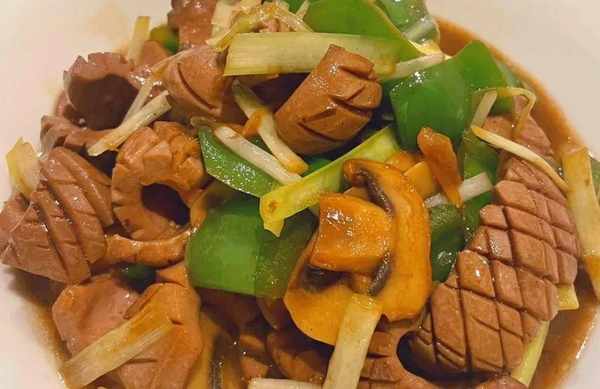 食材準備:豬腰子、青椒、薑絲、韭菜口蘑、蒜末。